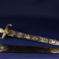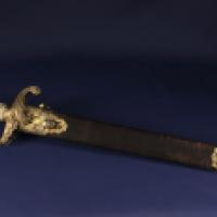Monture en bronze doré, le pommeau ciselé en forme de tête d'aigle, la garde inversée finement ciselée en forme de volute feuillagée.