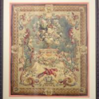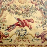 Projet de tapisserie ou de décor au bouquet de fleurs et perroquets dans des rinceaux feuillagés.