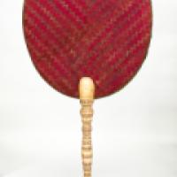 Large feuille garnie de tissu rouge, piqûres à la main, fixé au manche à l’aide de chevilles d’ivoire.