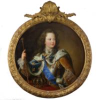 Notre tableau est une réduction en buste du grand portrait de sacre en pied peint par Hyacinthe Rigaud en 1715 (Versailles, Musée national du château. MV3695). L’artiste, entièrement consacré à la toile destinée au roi, avait confié les versions du grand portrait en pied à François-Albert Stiémart (1680-1740) et les réductions en buste destinées à certains commanditaires privés à La Pennaye et Bennevaux.
