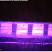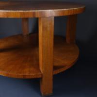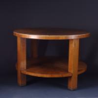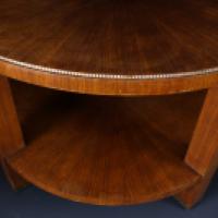 Guéridon circulaire en bois de placage (probablement Dalbergia decipularis) sur âme de chêne (Quercus) rehaussé d’une frise de denticules en incrustation d’ivoire d'éléphant (Elephas maximus, Loxodonta africana ou Loxodonta cyclotis) sur le pourtour du plateau supérieur. Reposant sur quatre pieds à section carrée reliés par une tablette d’entretoise, et terminés par des sabots. Estampillé au feu Ruhlmann sous le plateau d’entretoise.