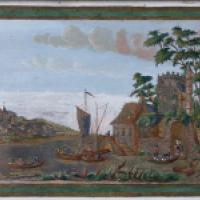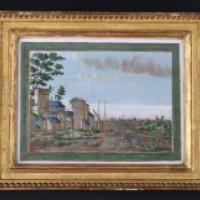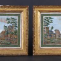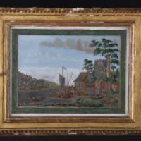Paire de petits tableaux rectangulaires polychromes et or sur feuille d’étain estampé représentant des vues de ports animés dans le goût flamand. Cadres de l’époque en bois sculpté et doré à rang de perles.