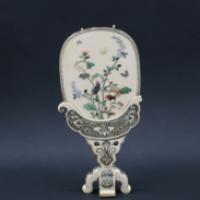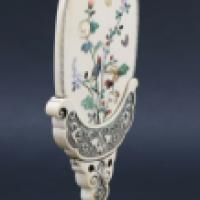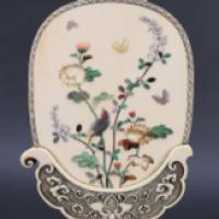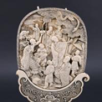Ecran de lettré en ivoire d’éléphant (Elephas maximus, Loxodonta africana ou Loxodonta cyclotis) sculpté sur une face d’une scène en relief illustrant la légende de Zennyo Ryûô, dragon légendaire invoqué par les moines Shubin et Kûkai dans le jardin Shinsen’en. La seconde face présentant un décor d’oiseau, papillons et fleurs incrusté de nacre (probablement Haliotis midae ou Haliotis discus) et pierres dures rouge et verte. - Quelques manques et restaurations au pied et en partie supérieure - Japon ère Meiji, dernier quart du XIXème, premier quart du XXème siècles - Hauteur totale : 21.5 cm - Poids : 237 g