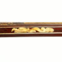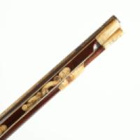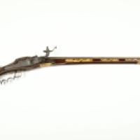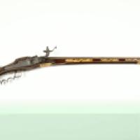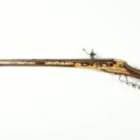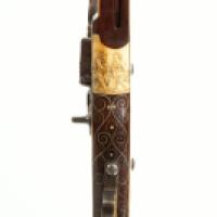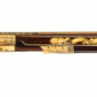 Sur les flancs de la crosse à droite cerf et biche au repos, à gauche cerf et chiens de meute affrontés. La pièce de pouce représente une polissonnerie sous la forme d'un personnage épicurien vu de dos d'une grande souplesse. A l'emplacement de la contre-platine, une plaque d'ivoire de morse représente un chasseur lutinant sa compagne adossée à un buisson, ses chiens attachés à un arbre, regardent, désespérés un lièvre s'enfuir, le texte suivant à la base complète la scène "Er richt reklein nach dem faun ernst noilt so facht er schon fraun". Les goupilles de crosse sont habillées d'incrustations de serpents de mer lovés et affrontés, des entrelacs incrustés également en ivoire de morse, décorent tous les plats de la monture sauf le fût de l'arme. Une très belle plaque gravée selon la technique du schrimshaw montre un chasseur musicien armé de son coutelas et d'une cabrette discutant avec une servante d'auberge dont la main tient un pot de bière. Détente directe, pontet à repose doigts, la crosse au niveau de la plaque de couche est enroulée en volutes supérieures et inférieures, le centre est concave et l'emplacement du dos de la crosse est habillé par un cylindre rappelant un bâton de maréchal en ivoire de morse massif à décor spiralé. Baguette bois à embout en ivoire de morse postérieure (d'un plus gros diamètre que l'âme du canon). Mécanisme fonctionnel.