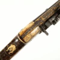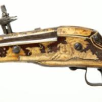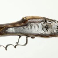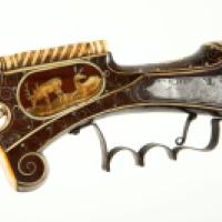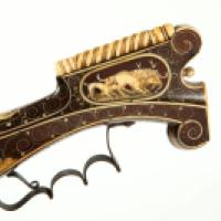 Les armes de prestige munichoises du début du XVIIème siècle sont célèbres pour le raffinement de leurs décors. La gravure en relief à fond d'or du canon est typique de cette production d'élite. Hieronymus Borstorffer (actif entre 1597 et 1637), travaillant en collaboration avec de grands fabricants tels Daniel Sadeler (actif entre 1602 et 1632) ou Caspar Sät (vers 1611-1691) fut l'un des plus fameux artistes spécialisés dans l'incrustation d'ivoire sur les armes destinées non seulement aux princes électeurs de Bavière, mais également aux cours européennes. L'utilisation d'ivoire de morse est très intéressante car rare dans la production. elle peut s'expliquer notamment par la présence de l'animal sur les côtes Nord du Pays ainsi que par les rapports entre les principautés germaniques et les royaumes scandinaves du Nord.