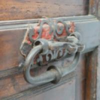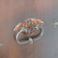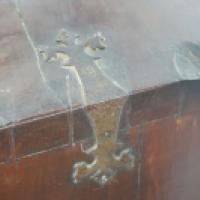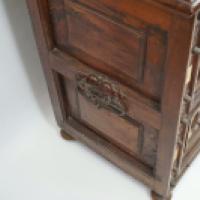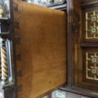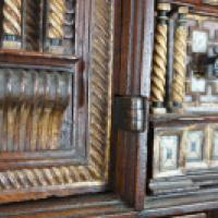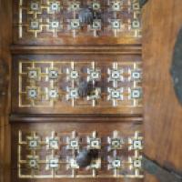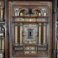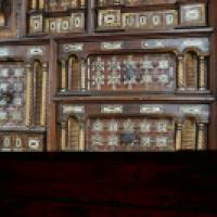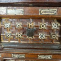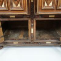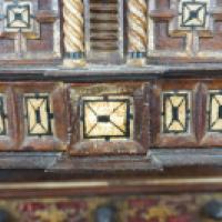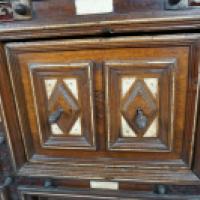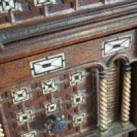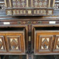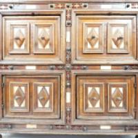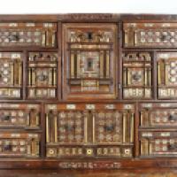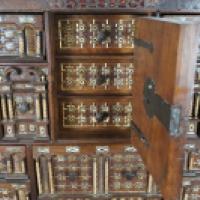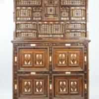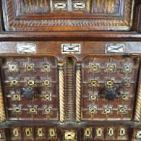 Bargueño en deux corps en bois naturel mouluré à riche décor incrusté en ivoire d'éléphant (Elephas maximus, Loxodonta africana ou Loxodonta cyclotis) et os, le corps supérieur ouvrant par onze tiroirs en façade et un portillon central découvrant trois autres tiroirs, le corps inférieur ouvrant par quatre grands tiroirs.