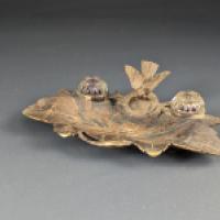 Encrier en bois sculpté représentant un oiseau sur une feuille de marronnier.