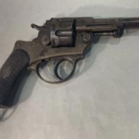 Revolver réglementaire français modèle 1874, marqué de la manufacture d'armes de St Etienne, canon daté 1878 avec indication "Mle 1874", plaquette de crosse en bois quadrillé, arme fonctionnelle, état moyen (carcasse oxydée avec nettoyage à opérer)