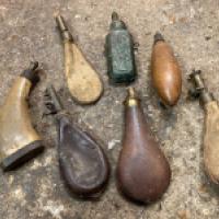 Lot de poires à poudre XIXème : 1 en cuivre, 2 en peau, 1 en bois, 2 en cuir et 1 en corne, états divers