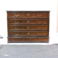 Commode de forme rectangulaire en placage de palissandre ouvrant à cinq tiroirs en façade, montants antérieurs à pans coupés, pieds moulurés, marbre blanc veiné encastré - XIXe siècle - H. 93 cm, L. 128 cm, P. 53 cm (petits manques)