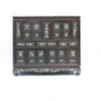 Meuble à hauteur d'appui de forme rectangulaire en bois mouluré ouvrant à vantaux coulissants, en partie haute, trois tiroirs au centre et quatre vantaux en partie basse. Décor incrusté de nacre figurant des oiseaux branchés, des ustensiles, des rinceaux - Indochine, début du Xxe siècle - H. 106 cm, L. 120 cm,