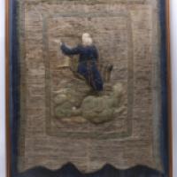 Bannière de procession en fils tissés argentés et dorés orné d'un Saint personnage auréolé dans une nuée - XVIIe-XVIIIe siècle - Sous cadre - Dim. cadre: 133 cm x 101 cm (accidents et manques)