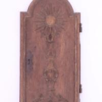 Porte de tabernacle cintrée en partie haute en chêne mouluré et sculpté à décor d'un candélabre surmonté d'un soleil - XVIIIe siècle - 45 cm x 22 cm