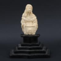 Sujet en ivoire de morse (Odobenus rosmarus divergens) sculpté représentant Sainte Véronique, reposant sur un socle à gradins en bois noirci.