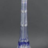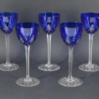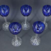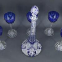 - Partie de service de six verres et une carafe en cristal taillé de couleur bleue à décor d'étoiles et de treillages, jambes à pans coupés