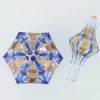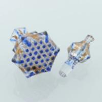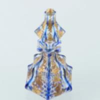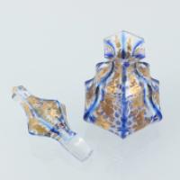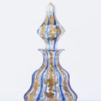 Flacon en cristal blanc et bleu rehaussé d’or avec bouchon, motifs de roses dorées.
