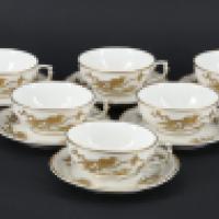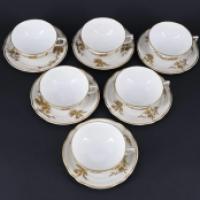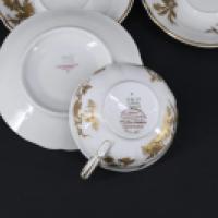 BERNARDAUD Limoges Partie de service à thé composé de 6 tasses et sous tasses en porcelaine, service pour la venue de la Reine Elisabeth lors de sa visite en France en Avril 1957. Liséré en or et motifs oiseaux et de végétaux. Taches, manques aux filets d’or H : 4, L : 10 cm XXème siècle.