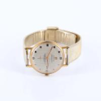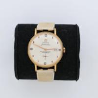 OMEGA Seamaster - Montre bracelet d'homme, boîtier en métal doré, bracelet métallique rapporté. Cadran à fond champagne, guichet dateur à 3 heures, trotteuse à 6 heures. Mouvement mécanique fonctionnel à réviser