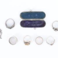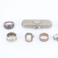 Lot en argent (800 et 925 mil.) comprenant: Sept bagues, une chaîne,une petite boîte oblongue - Poids: 60 g. (accidents et manques)