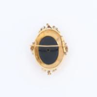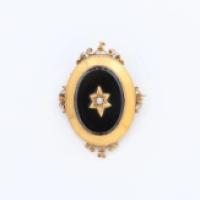 Broche en or jaune 18 carats (750/°°) de forme ovale sertie d'une pierre noire centrée d'une demie perle dans une étoile.