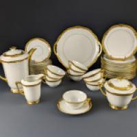 Partie de service à café en procelaine blanche à liseré doré composée de : une cafetière, un sucrier couvert, un pot à lait, 10 tasses et 12 sous-tasses, un plat à gâteau, 12 assiettes à gâteau.
