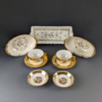 Lot de porcelaine composé de : un plat à cake, deux raviers ovales, deux tasses à thé et leur sous-tasse et deux petites coupes.