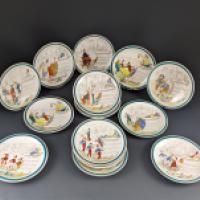 Terre de fer, ensemble de 14 assiettes à dessert à décors d'airs d'opéra (Les noces de Jeannette, Faust x2, Lucia di Lammermoor x2, Les dragons de Villars x2, La muette de Portici, Guillaume Tell, Le barbier de Séville, Le pré aux clercs, Mignon, Robin des bois, La dame blanche)