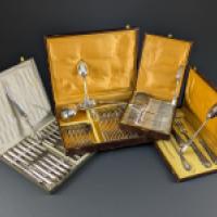 Ménagère en métal argenté modèle fleuri à rinceaux et agrafes, composée de : 12 couverts de table, 12 petites cuillers, 1 louche et 1 cuiller à ràgoût dans son écrin; 12 couteaux de table et 12 couteaux à fruits dans un écrin; 12 couverts à dessert dans un écrin; 1 couvert à découper, 1 manche à gigot et 1 couvert à salade dans un écrin.