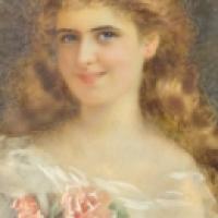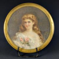 Miniature circulaire peinte à la gouache sur feuille d’ivoire d’éléphant (Elephas maximus, Loxodonta africana ou Loxodonta cyclotis) représentant une jeune femme au bouquet de rose, signé L . Rallier du Baty vers le bas à droite. Dans une lunette en laiton doré.