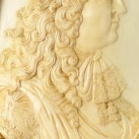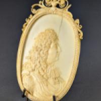 Rare médaillon en ivoire d’éléphant (Elephas maximus, Loxodonta africana ou Loxodonta cyclotis) monobloc sculpté représentant Louis XIV de profil droit, dans un encadrement de frise de feuillages surmonté d’un fronton de personnage grotesque et rinceaux feuillagés. Gerce longitudinale en partie haute et légers manques aux rinceaux.