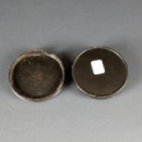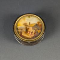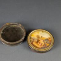Boîte de forme circulaire en écaille de tortue (Eretmochelys imbricata), ornée d'une miniature peinte sous verre sur le couvercle.