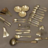 Important lot de métal argenté composé de couverts de table, couteaux, petites cuillers, couteaux à beurre, pice à sucre, présentoir.