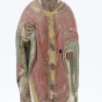 Saint Nicolas en bois sculpté polychrome. Manque sur la polychromie et la sculpture (mains, nez Début du XIXème siècle H : 29, L : 10, P : 7 cm
