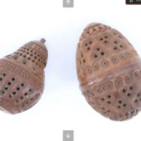 Deux œufs à chapelet en corozo sculpté et ajouré. Accidents et manques. Fêles. H : 6, L : 4 cm H : 5, L : 3.2 cm