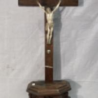 Christo vivo en ivoire d’éléphant (Elephas maximus, Loxodonta africana ou Loxodonta cyclotis) sculpté représenté tête tournée à droite, les yeux levés vers le ciel. Titulus crucis et Golgotha également en ivoire. Fixé sur une croix reposant sur une base en chêne naturel mouluré et sculpté de têtes de chérubins et d’un cartouche vierge surmonté de deux chérubins tenant une couronne, l’ensemble supporté par trois pieds boule.