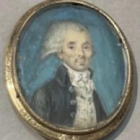 Miniature à la gouache sur médaillon en ivoire figurant un buste d'homme, fond en nacre, cerclage en laiton