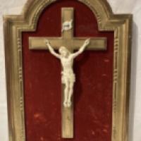Christ fixé sur une croix en bois doré, titulus crucis au dessus de sa tête, fixé dans un cadre en bois doré avec fond de velours rouge