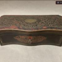 Boîte à gants d'époque Napoléon III en placage de bois noirci et marqueterie de style Boulle à fond d'écaille de tortue (Eretmochelys imbricata) teintée vermillon, à décor en première partie en laiton de rinceaux feuillagés ouvrant par un couvercle supérieur sur charnière.