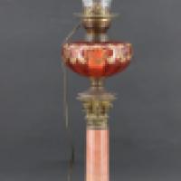 Lampe à pétrole disposée sur une colonne en marbre rouge/rosé sommé d'un chapiteau en bronze doré, elle repose sur un socle carré soutenu par quatre pieds enroulés de feuillages et coquilles.
