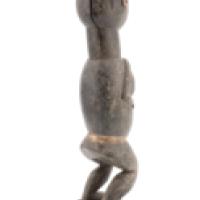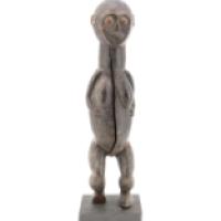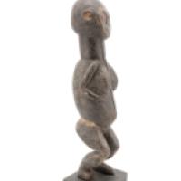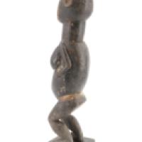 Sculpture en bois patiné représentant un ancêtre féminin aux bras se tenant le haut des hanches.
