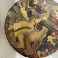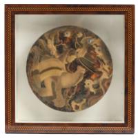 Plaque circulaire en écaille de tortue (Eretmochelys imbricata) laquée et incrustée de nacre, à décor d'un rapace aux ailes déployées chassant un oiseau plongeant dans l'eau tumultueuse. L'encadrement à décor d'une frise de damier en marqueterie de bois.