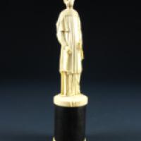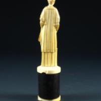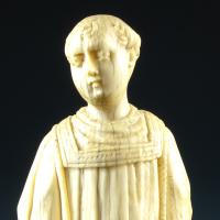 Saint Laurent en ivoire d’éléphant (Elephas maximus, Loxodonta africana ou Loxodonta cyclotis) sculpté, reposant sur une base circulaire également en ivoire solidaire du socle en tambour de colonne en bois noirci supporté par un disque en ivoire.