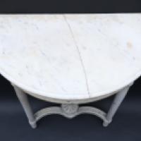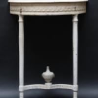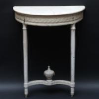 Console de style Louis XVI de forme demi-lune en bois laqué blanc, mouluré et sculpté à décor en ceinture d’une frise de sequins reposant sur deux pieds fuselés reliés par une entretoise ornée d’un vase à l’antique. Dessus de marbre blanc collé