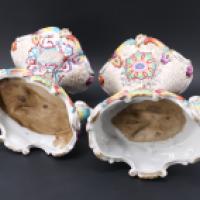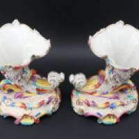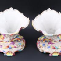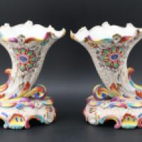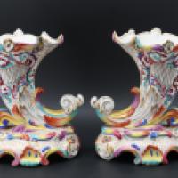 Paire de vases en faïence en forme de corne d’abondance à décor polychrome de fleurs et rehauts de dorure