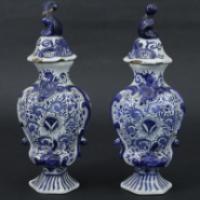 Paire de vases couverts de forme hexagonales en faïence blanche à décors de rinceaux et cartouches