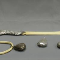 Lot composé de deux hochets, d'un coupe papier en ivoire etpaper-knife argant fourré et d'une boîte à pièces en métal argenté.