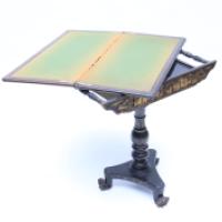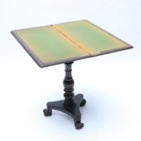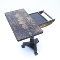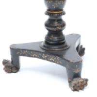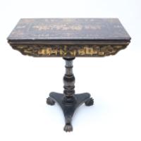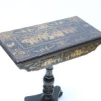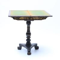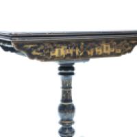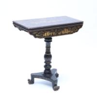 Table à jeu en bois laqué noir et or à décor de personnages dans le goût de l’Extrême-Orient, fût balustre à décor de feuillages, piètement tripode reposant sur un piètement central tourné