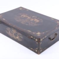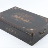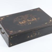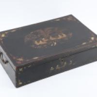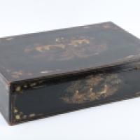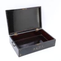 Coffret de forme rectangulaire en laque noire et or à décor à toutes faces de personnage et végétaux, deux anses latérales