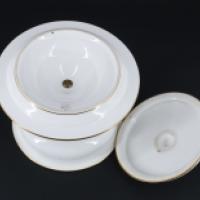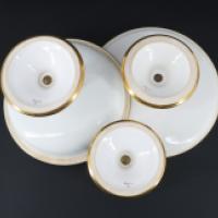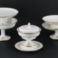 Partie de service en porcelaine à décor de liserés doré et chiffre comprenant : 1 compotier couvert avec son dormant fixe et 4 présentoirs sur piédouche