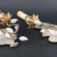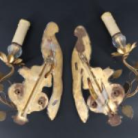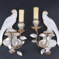 Paire d’appliques en verre et métal doré à un bras de lumière orné d’un perroquet posé sur une urne Médicis